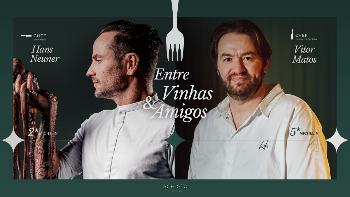 O Schistó convida para uma experiência gastronómica única. Os chefs Hans Neuner (2★ MICHELIN) e Vítor Matos (5★ MICHELIN) unem-se num jantar irrepetível sob o tema “Entre vinhas e amigos”.